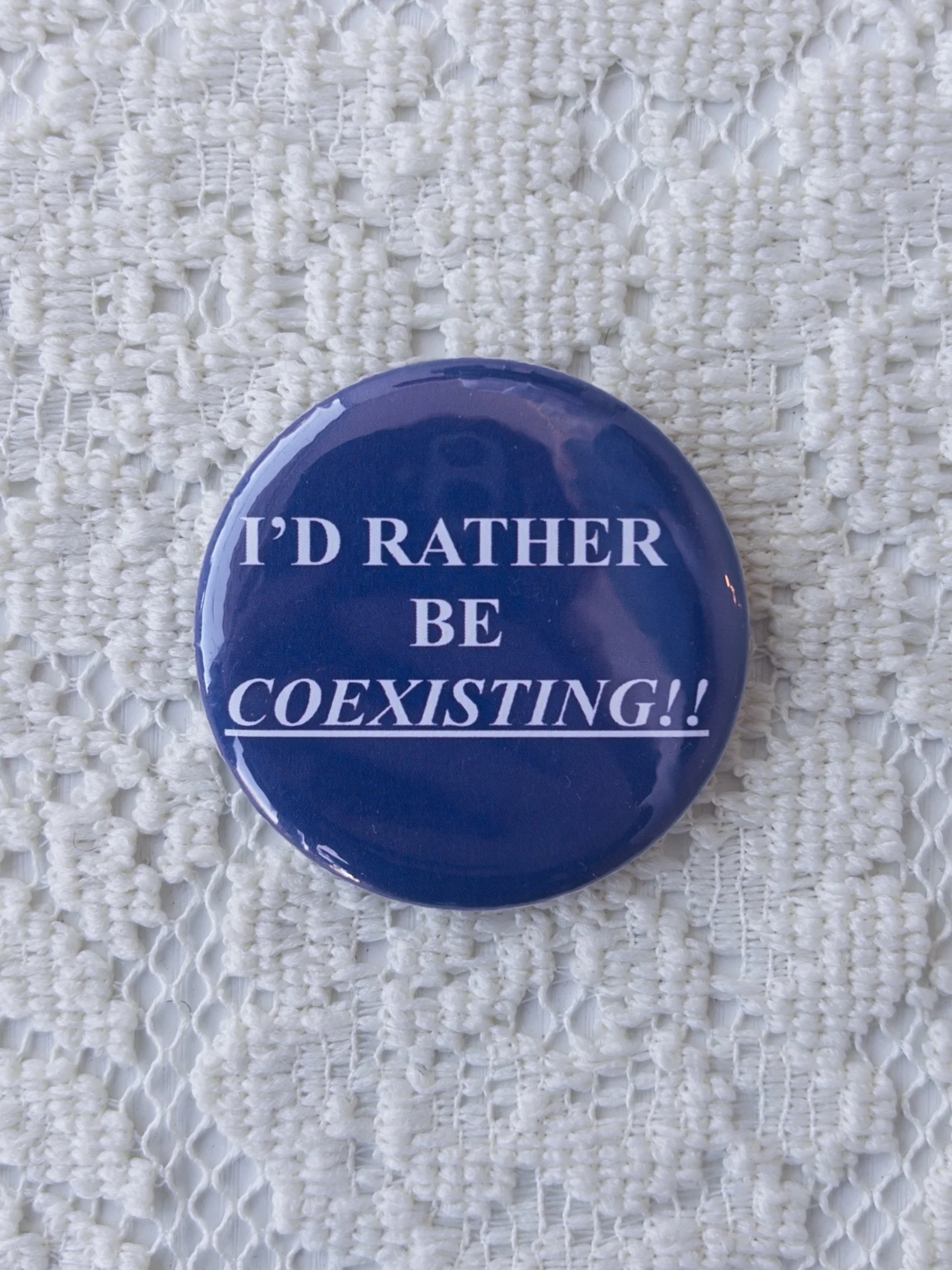Shop › Coexist Pin Image 1 of 1 Coexist Pin $6.00 2.25” pin by Tinky Footwear Add To Cart Added! 2.25” pin by Tinky Footwear