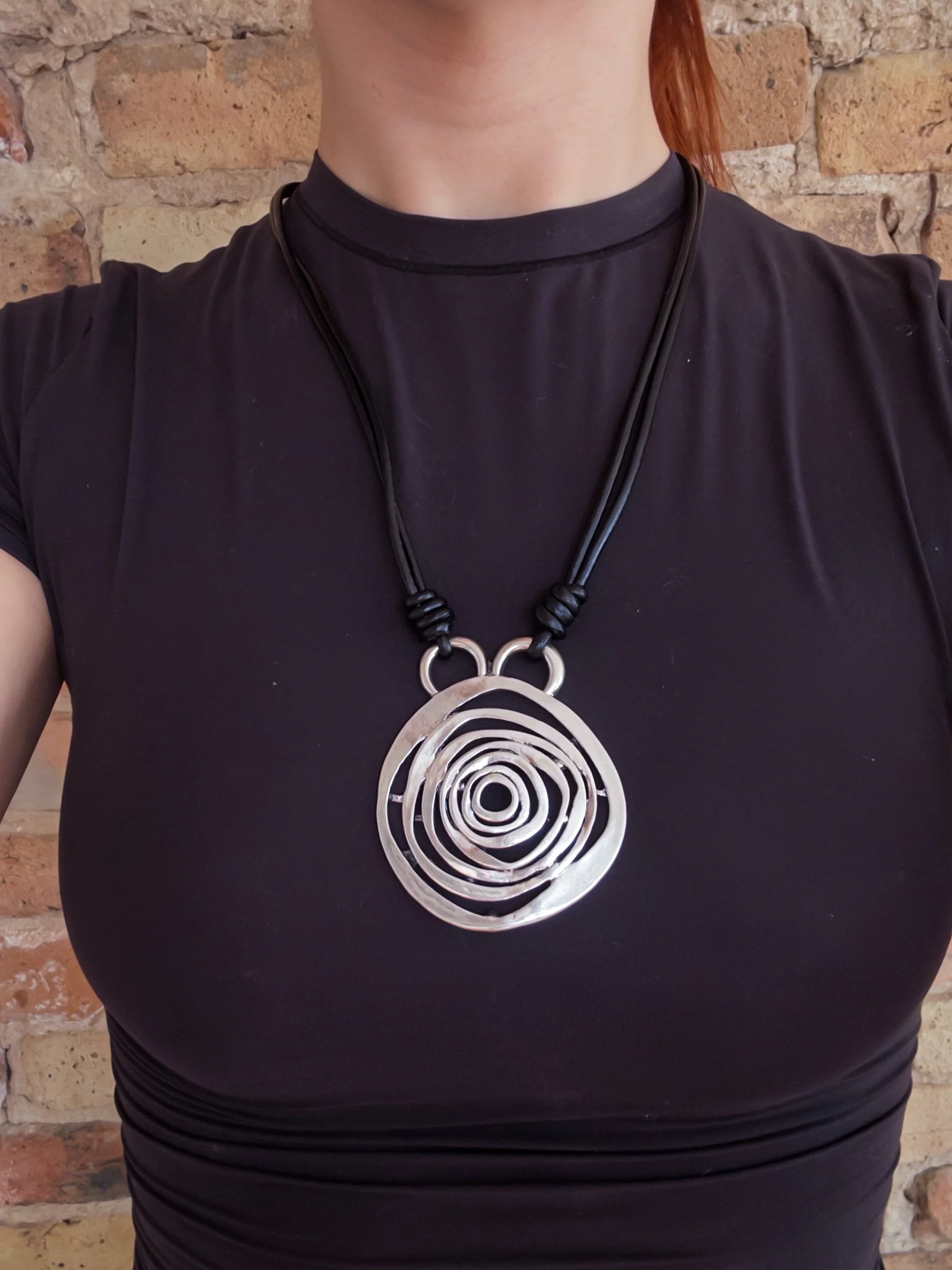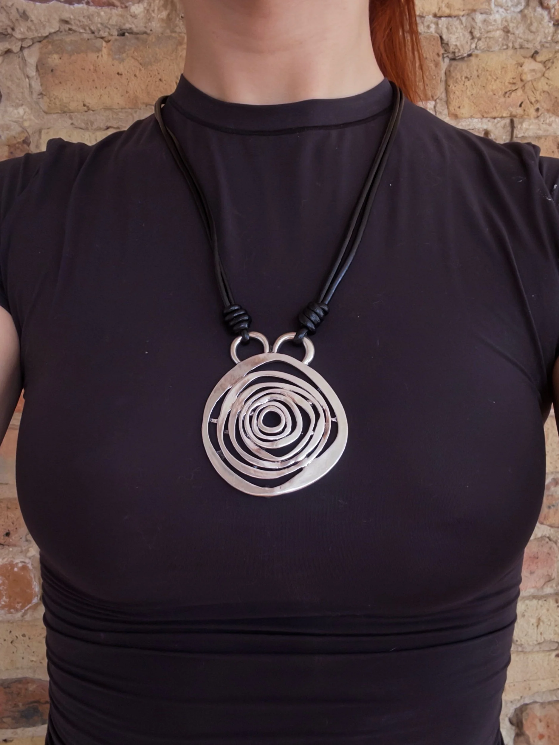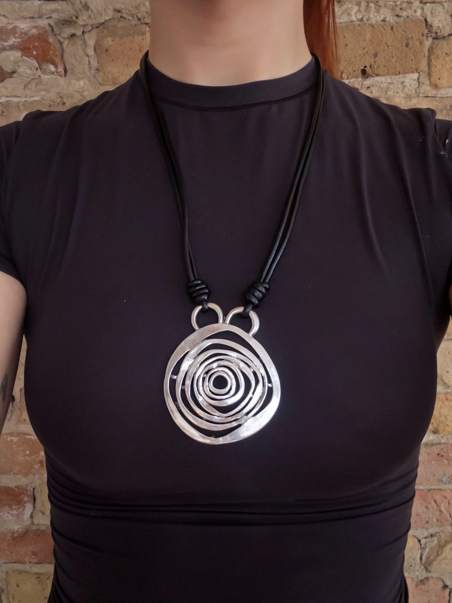 Shop › Spiral Necklace Image 1 of 3 Image 2 of 3 Image 3 of 3 Spiral Necklace $32.00 y2k vintage silver tone necklace on black cordadjustable back closure Add To Cart Added! y2k vintage silver tone necklace on black cordadjustable back closure
