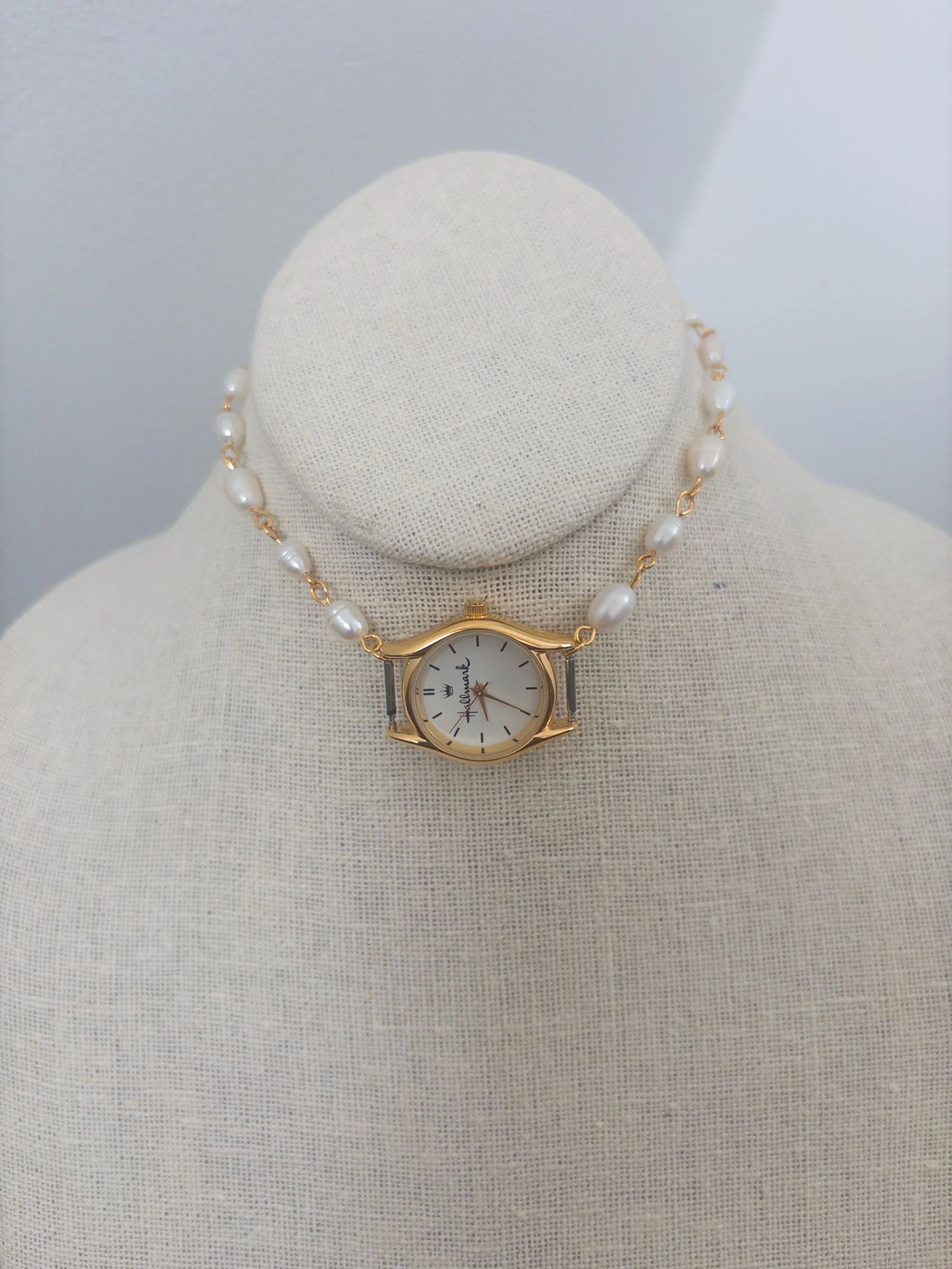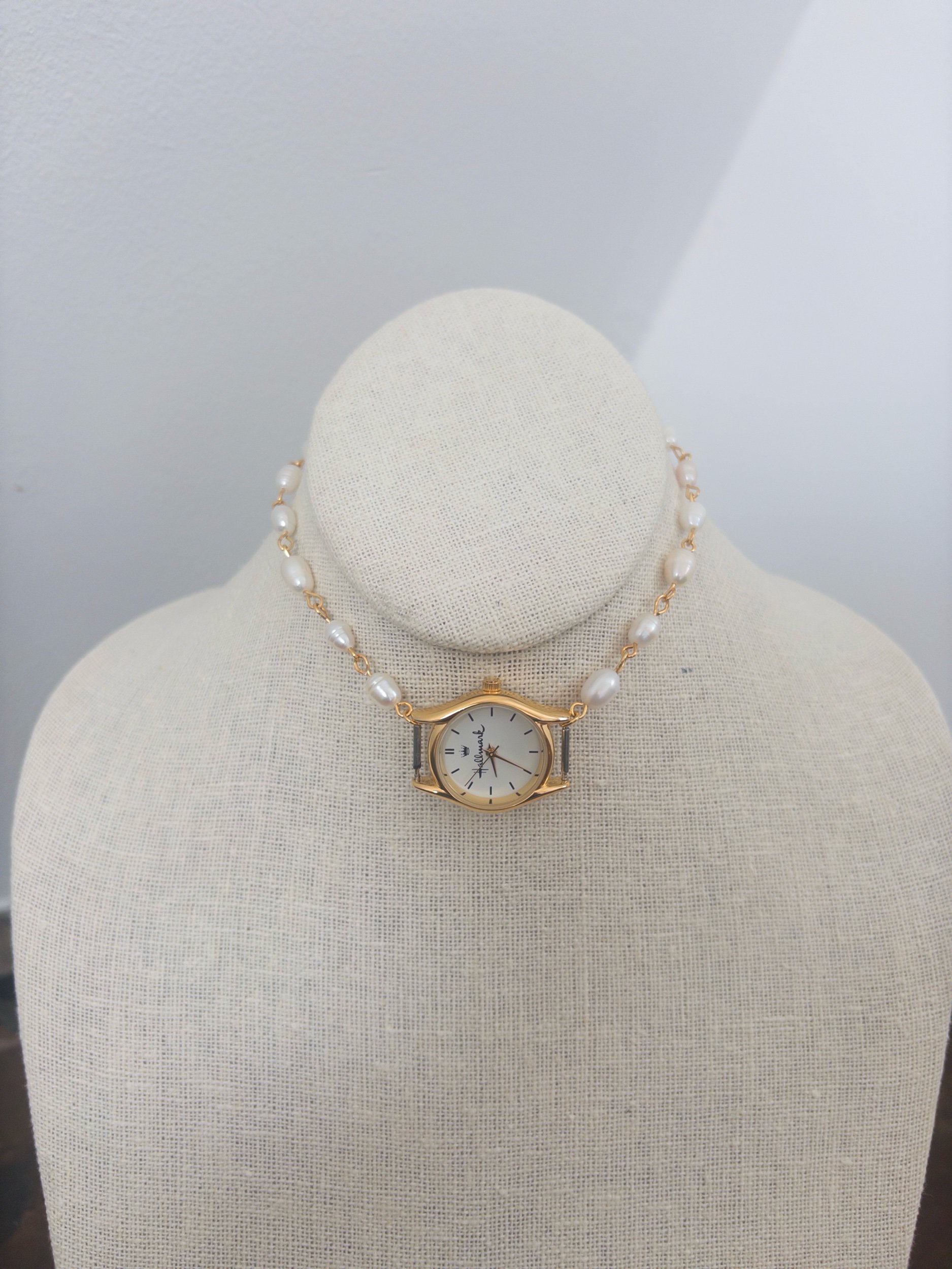 Shop › Gold Time Choker Image 1 of 3 Image 2 of 3 Image 3 of 3 Gold Time Choker $50.00 1/1handmade from freshwater pearls + vintage watch facegold toneadjustable back Add To Cart Added! 1/1handmade from freshwater pearls + vintage watch facegold toneadjustable back
