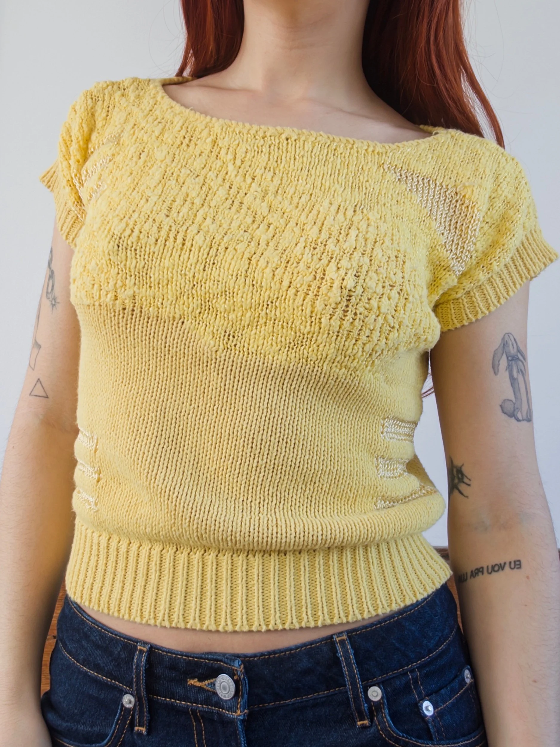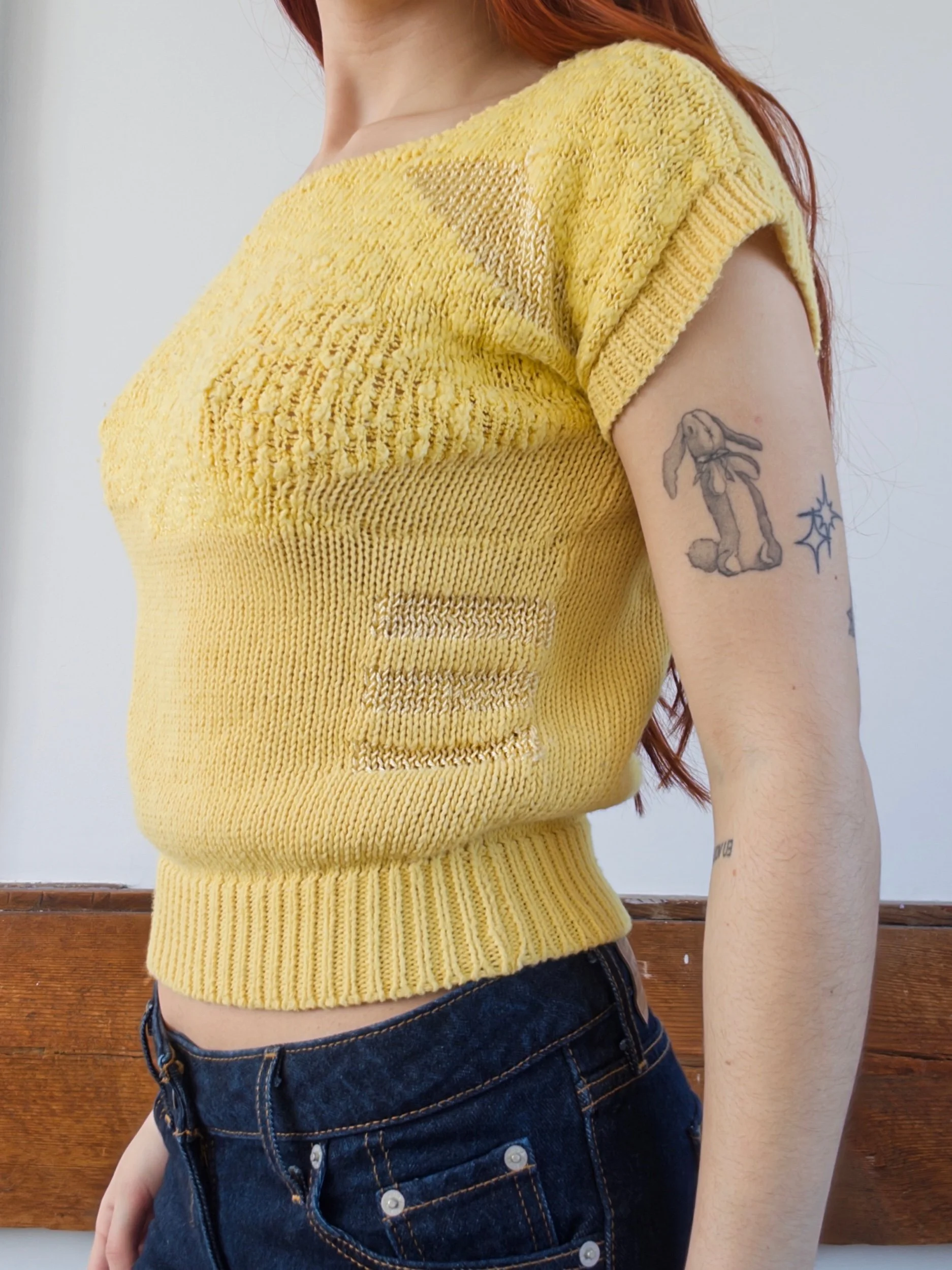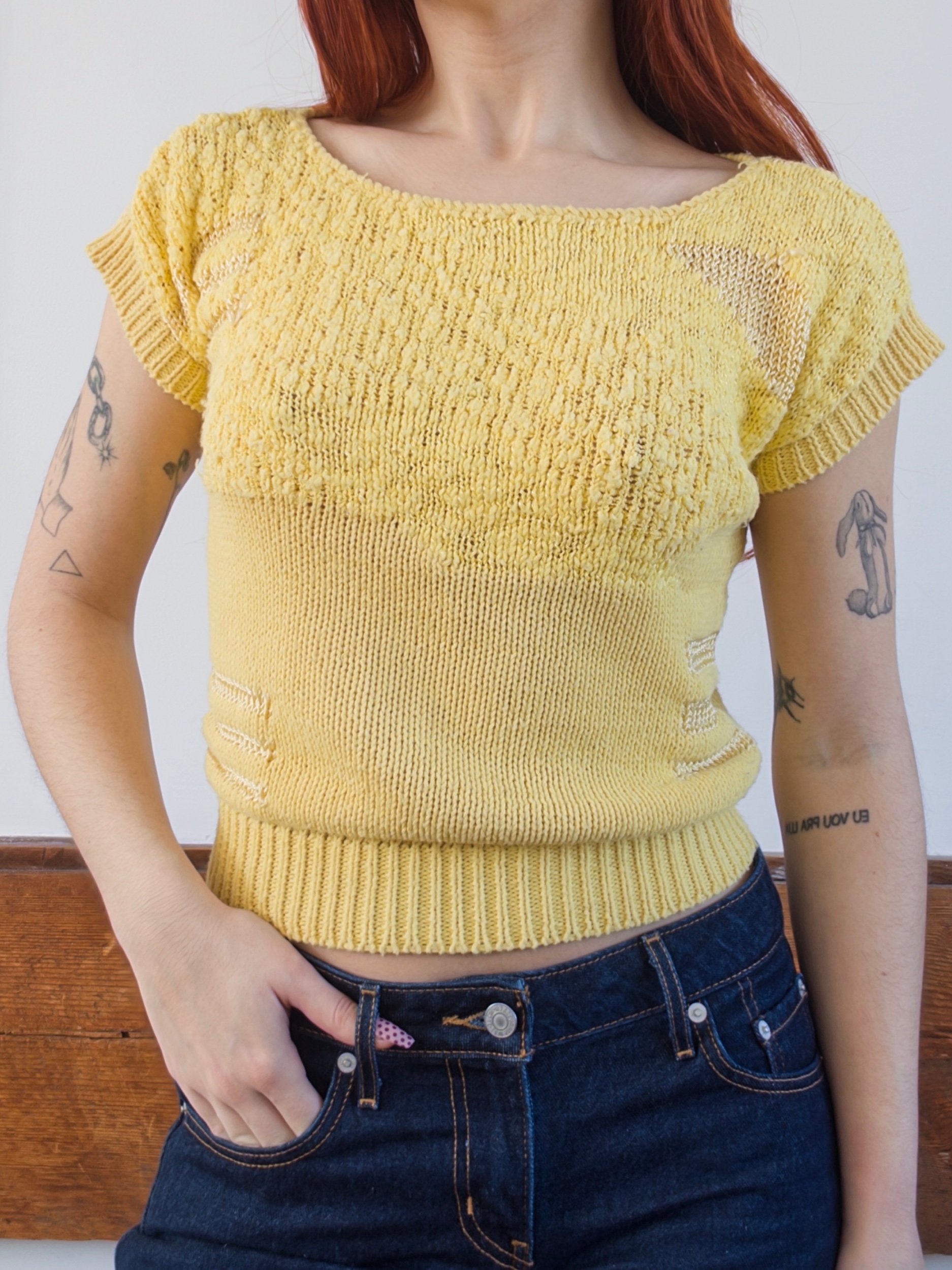 Shop › Yellow Knit Tee Image 1 of 4 Image 2 of 4 Image 3 of 4 Image 4 of 4 Yellow Knit Tee $35.00 1980s vintagesize small87% acrylic 13% nylon Add To Cart Added! 1980s vintagesize small87% acrylic 13% nylon